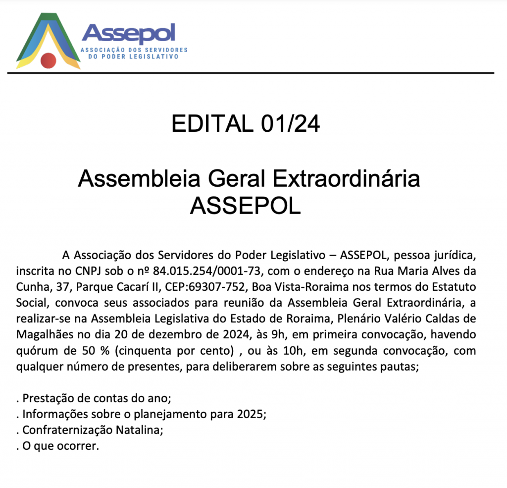 A Associação dos Servidores do Poder Legislativo – ASSEPOL, pessoa jurídica, inscrita no CNPJ sob o nº 84.015.254/0001-73, com o endereço na Rua Maria Alves da Cunha, 37, Parque Cacarí II, CEP:69307-752, Boa Vista-Roraima nos termos do Estatuto Social, convoca seus associados para reunião da Assembleia Geral Extraordinária, a realizar-se na Assembleia Legislativa do Estado de Roraima, Plenário Valério Caldas de Magalhães no dia 20 de dezembro de 2024, às 9h, em primeira convocação, havendo quórum de 50 % (cinquenta por cento) , ou às 10h, em segunda convocação, com qualquer número de presentes, para deliberarem sobre as seguintes pautas; . Prestação de contas do ano; . Informações sobre o planejamento para 2025; . Confraternização Natalina; . O que ocorrer.